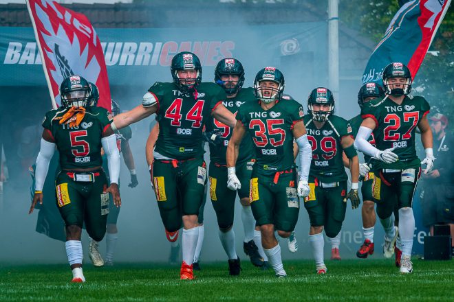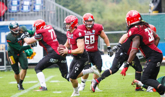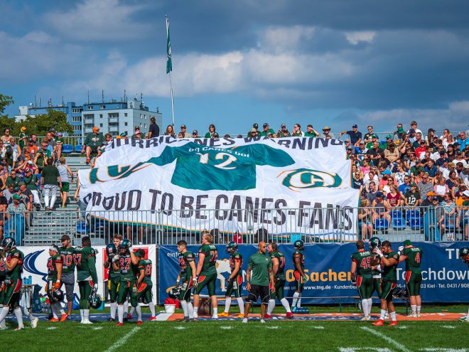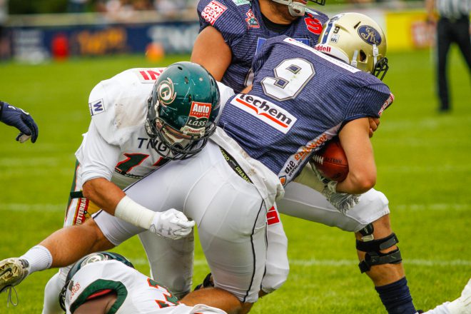 Die Defense überzeugt mit einem starken Spiel gegen Hildesheim, während ich nur ein Hot-Dog esse. Sind wir in Bizarro-World oder was ist da los? (Bild © Dieter Bethke)