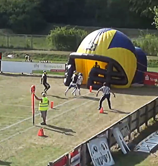 Touchdown? Ja, es sieht zumindest so aus, und auch mein erster Gedanke am Stream war: Touchdown, dragged. Markell Castle hat den Ball gefangen (und bis zum Ende nie verloren) und einen Fuß in der Endzone geschleift. Leider kann ich den Stream nicht Bild-für-Bild laufen lassen, im nächsten Bild sind sie schon eine halbe Sekunde weiter.