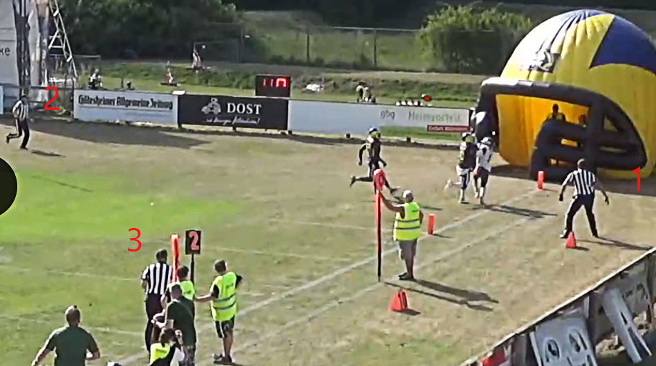 Schiedsrichter Eins schaut auf den Fang, nicht die Füße. Dadurch verpasst er den Touchdown, denn er sieht zwar, dass der Ball gefangen wurde, aber nicht in welcher Position des Feldes. Da seine Seitenlinie aber die bedrohte war, hätte er auf den Boden gucken sollen, während Ref#2 den Fang (den er auch besser, da von vorne, sieht) beurteilen sollte. Ref#3 hatte eigentlich den besten Blick für Inbounds oder nicht, aber ist halt schon 25m weg. Er mischte sich auch nicht in die folgende Diskussion ein. So war also (nach meiner Meinung) der Touchdown entgangen. Wieso aber auch die DPI? Meine Erklärung: Die Schiedsrichter haben sich danach nur über Fang oder Nicht-Fang unterhalten, nicht über eine Passbehinderung. Da alle anderen Refs weiter weg waren, hat man dies wohl für korrekt erachtet. Wenn die DPI tatsächlich diskutiert wurde: Sorry, besser werden! Sonst wird aus 40m Entfernung eine Flagge geworfen, weil jemand einen Block in den Rücken auf der anderen Seite eines Punt-Returns gesehen hat, und hier wird eine unglaubliche klare Sache übersehen. Das bei einem 14-7 Spiel zu dem Zeitpunkt. Sehr unglücklich gelaufen.
